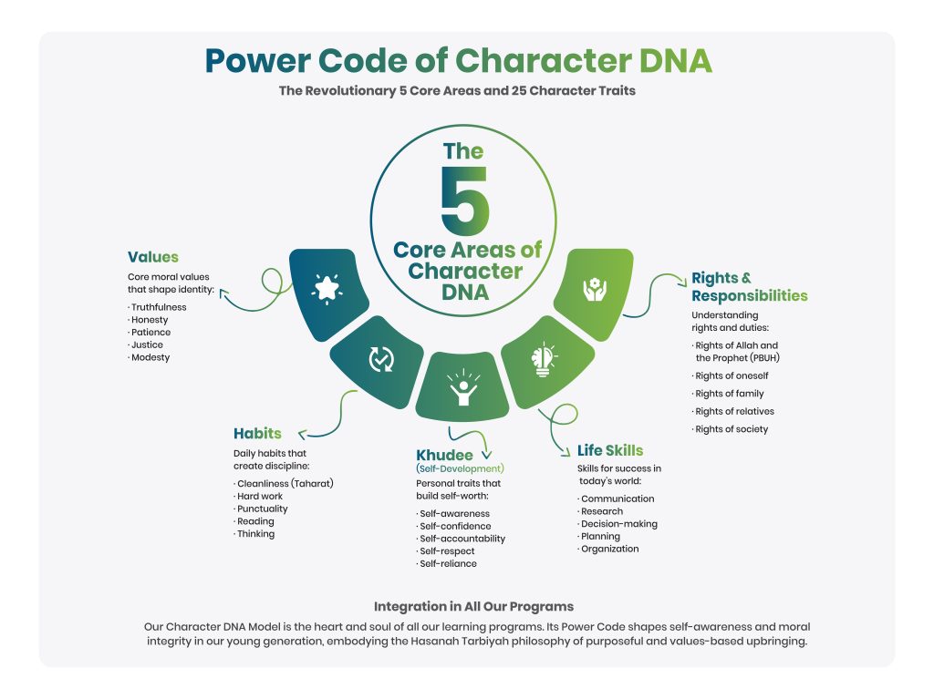 Nurtures the cultivation of 25 attributes within an individual’s character, with primary components encompassing values, habits, self-development, skills and responsibilities.